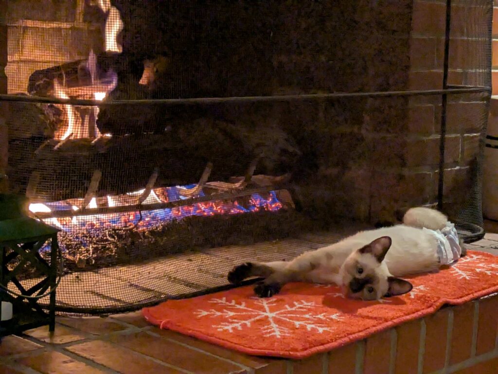 Our ridiculous rescue kitten Etta, warming herself in front of the fireplace. Due to permanent injuries she received before we got her, she has to wear a diaper, which increases both our labor and the cuteness quotient.